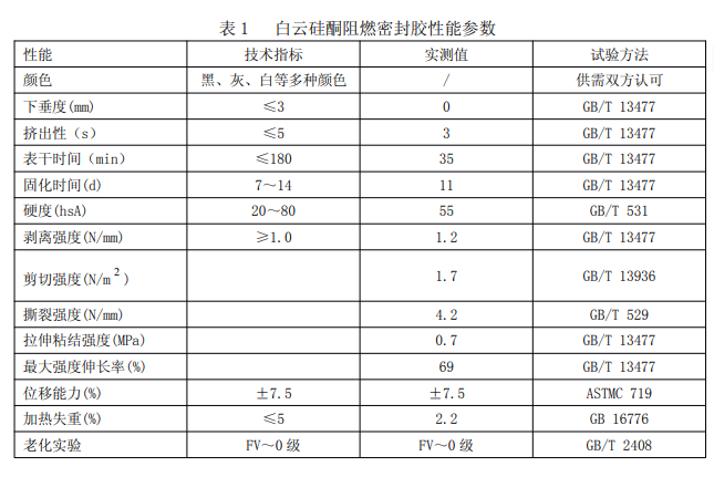 用于穿樓層管道與樓板孔的縫隙及幕墻防火層與樓板接縫處密封,白云粘膠廠硅酮阻燃密封膠性能參數見表 1。